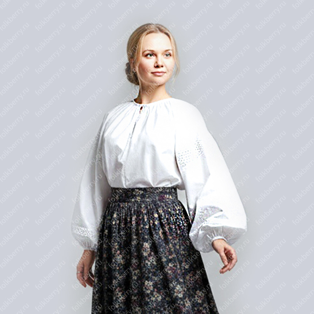 Блуза выполнена из белого шифона. Пышный рукав, по запястью волан. Декор золотистого или серебристого цвета.Для правильного размера напишите, пож-та, Ваш рост, окружность груди, ширину плеча и длину рукава.