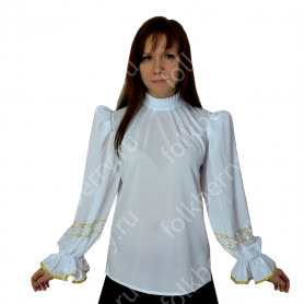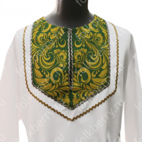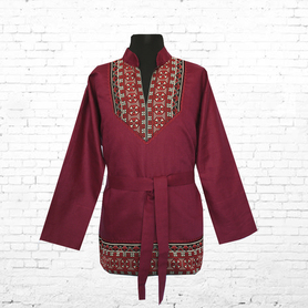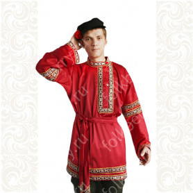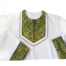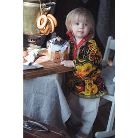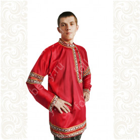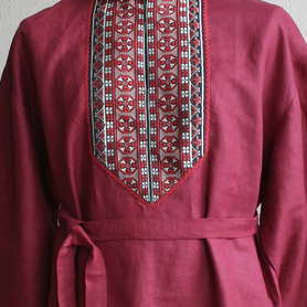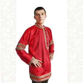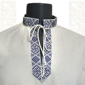 Косоворотка Оберег - выполнена из льна белого цвета, украшена жаккардовой лентой шириной 3 см синего цвета. Косоворотка смотрится стильно и современно, сочетается с современными элементами одежды, хотя содержит в себе элементы традиционного кроя и орнамента. В комплект входит пояс-кушак.
