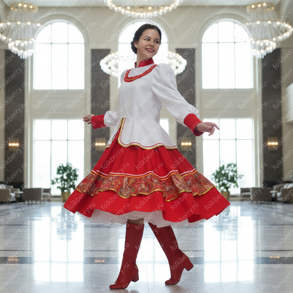 Костюм  выполнен из габардина и красиво подобранного декора в золотистых цветах. Достоинства габардина  в том, что он не мнется, не блестит, как атлас, ложится красивыми  мягкими складками, цвет не выгорает. Юбка  с оборкой, декор в золотистых цветах, по талии на  двойной резинке. Блуза  белого праздничного цвета, с баской,  рукава расширены внизу, с манжетами.   Сзади на блузе шнуровка. Она дает хорошую посадку по фигуре. Костюм предназначен для творческих  сольных и коллективных театральных выступлений.