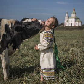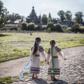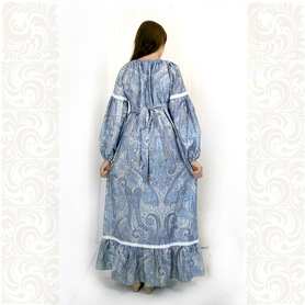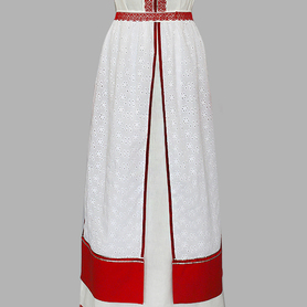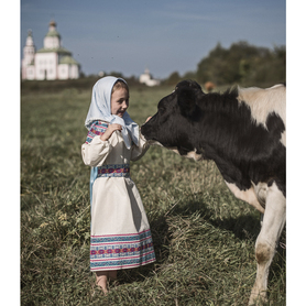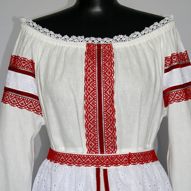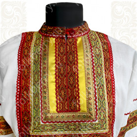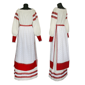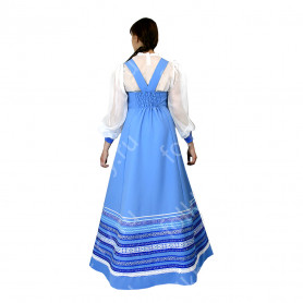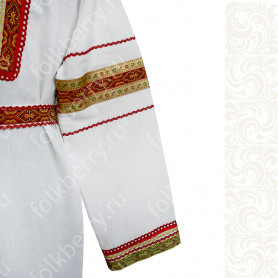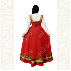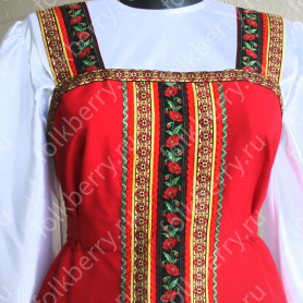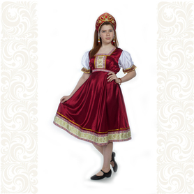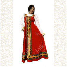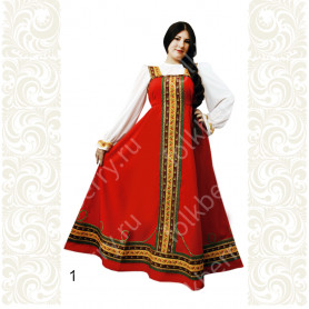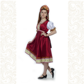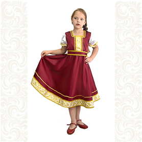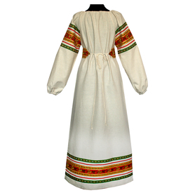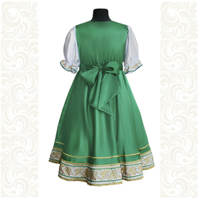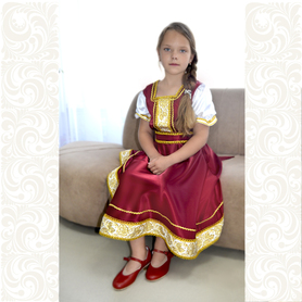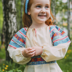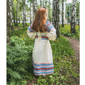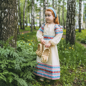 Платье «Дмитра» – отличный вариант наряда для тематических праздников  в детском саду и школе, православных и других мероприятиях. Платье  хорошо садится по фигуре и удобное в носке, благодаря регулируемой горловине, рукаву реглан, длинному поясу.  Юбка (почти солнце) длиной немного ниже колена эффектно смотрится при исполнении танца. Талия  немного завышена. Декор платья - жаккардовая тесьма с обережными символами. Платье шьется из габардина, из матовой, немнущейся ткани ярких цветов.