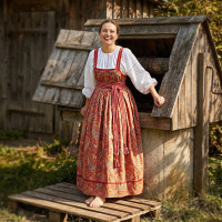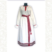 Платье «Солдатка» отрезное по талии, рукав реглан, юбка-почти солнце, длиной немного ниже колена. В комплект входит пояс. Важно, что декор платья выдержан в славянском стиле. Это платье - современное прочтение народных традиций. Женственное, удобное и нарядное, оно дарит ощущение радости и праздника. По стилю замечательно подходит для тематических праздников в детских учебных заведениях, по фасону и яркости цветов отлично подойдет для танцевальных коллективов. как правило, дети не стесняются надевать его ( в отличии от длинного русского сарафана ) Платье выполнено из немнущейся, матовой ткани "габардин" символичных для славян цветов ( красного, синего, зеленого, бордового).