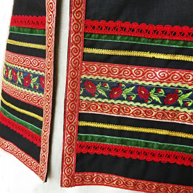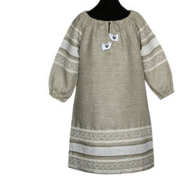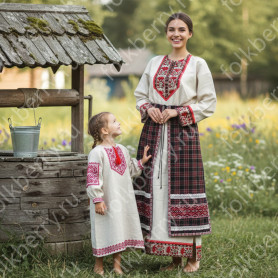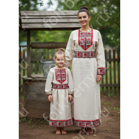 Эта традиционная женская рубаха ( длинная туника с поликами под мышками, с разрезами по бокам, с поясом) из белого льна декорирована по низу рукава, подолу и на груди широкой жаккардовой тесьмой со славянскими обережными символами красного цвета на белом фоне.