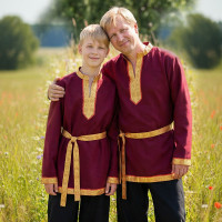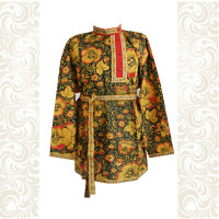 Косоворотка "Егорий" ( рубаха с косым воротом, то есть с разрезом сбоку, а не посередине ) выполнена из льняной ткани. Рукав спущен, под мышкой вставка - ластовица. По вороту, рукавам, низу декор из жаккардовой тесьмы. В комплект входит пояс ( кушак) из ткани.