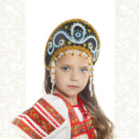 Приталенная модель хорошо сидит по фигуре, расклешенная книзу дает крупные мягкие волны. Сзади расположена застежка «молния». Талия дополнительно подчеркивается поясом. Плечики регулируются по длине. Сарафан украшен широкой полосой из жаккардовой тесьмы, вьюнка, золотистого шнура, кружева.