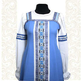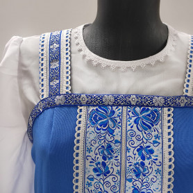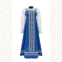 Сарафан с блузой – яркий наряд в духе народных традиций. Оригинальный дизайн, красивые оттенки синего, бирюзового, белого цветов, качественное исполнение комплекта порадуют Вас. Это хороший выбор для участников танцевально-театральных коллективов.